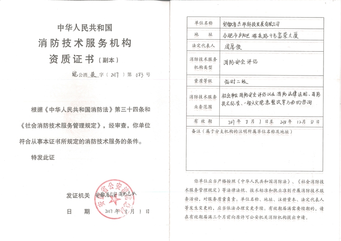 新消防評估資質證書正本
