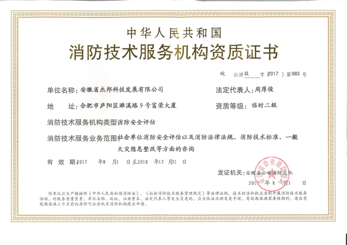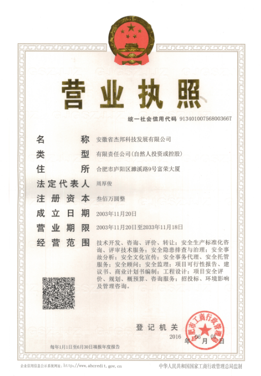 安徽省杰邦科技發展有限公司為科技型民營企業,2003年11月成立,注冊資本300萬元。辦公場所合肥市廬陽區濉溪路9號富榮大廈26樓。近20年來,公司長期從事安全評價、安全生產標準化評審、安全咨詢、安全培訓、消防安全評估等技術工作。現有安全評價資質證書(編號:APJ-(皖)-018),業務范圍:石油加工...